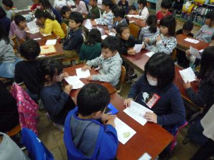紹介カードに自分の好きな本の好きな場面を書き、1・2年生、3・4年生、5・6年生がペアになってお互いのカードを紹介しあっています。