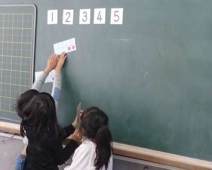 初めて算数のノートを開き、最初の1ペーシ゛にたくさん書きました。