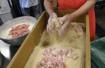 チキンカツは給食室で一つずつ衣をつけて手作りをしています。