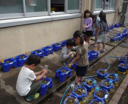 いつ芽が出るのかと一生懸命に水やりをし観察している児童もいます。