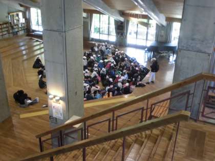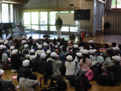 スコアオリエンテーリングを終えた子どもたち。たくさん歩いて疲れている中でも、先生の話をしっかり聞く姿。素敵でした。