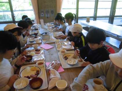 あさのつどいの後は、朝食。昨夜の夕食は5時でした。子どもたちのお腹はとってもすいていたようです。朝から、沢山おかわりして食べていました。
