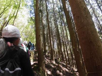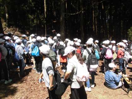 一つ目の峠、寺山峠に差し掛かると、これまで見えなかった空が見えてきて、明るく開けた場所に出てきました。光が差し込むと、「もうすぐだー。」と疲れていた子も、少し元気が戻ってきました。