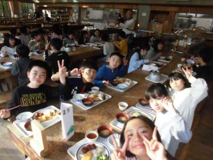 本日の夜も山の家でのバイキングです。今日は山登りでお腹もすいた子どもたち。夕食を前に笑顔いっぱい。何度もおかわりをして食べていました。ただ・・・食べすぎは注意ですね。