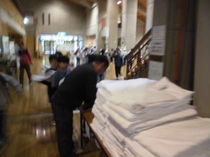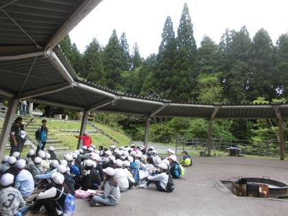 シーツを返却し、昨日キャンプファイヤーをした営火場で朝のつどいをしました。今日の天気はくもり。少し肌寒い朝です。それでもみんなの笑顔はいっぱいです。