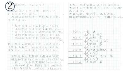 2.は奈良へ行ってみようをテーマにまとめています。奈良公園にあるものだけではなく、行くまでの方法を時間などとセットで調べています。他にも、奈良公園に行ったらあるものや調べたいものが書かれていました。