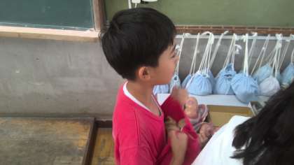 写真は赤ちゃんが誕生する際の平均の体重を調べた後、実際に体感している様子です。