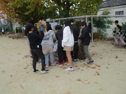 美化委員会が企画してくれた落ち葉拾いがありました。冬が近づき、学校は落ち葉がたくさん。5年生も一生懸命、落ち葉を拾ってくれました。