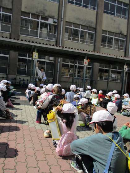 今日は1・2時間目に校区たんけんを行いました。学校の周りや1号線の周りなど場所によってどのように様子がちがうかを調べながら歩きました。学校で校区の歩き方を確認して出発です!