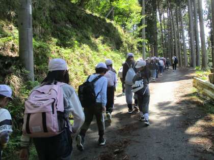 峠からは、バスを降りて山の家の職員さんと共に山の家まで歩きました。山の中の自然に触れながら山の家に向かう気持ちを高めていました。到着時には、山の家で待ち受けていた教員に元気いっぱいの笑顔で手を振ってくれました。まだまだパワー全開です!