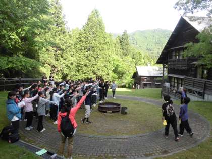 爽やかな晴天の下、花背山の家宿泊学習2日目がスタートしました。全員で朝の集いに参加し、2日目の活動のめあて「『自立』『協力』〜考えを育むWAY・心を育むWAY〜」を確認し、改めて今日一日を元気に楽しく過ごそうと気合が入ったようでした。急遽ストレッチ体操をすることになりましたが、そこでも「自分達で考えてやる姿」が見られました!