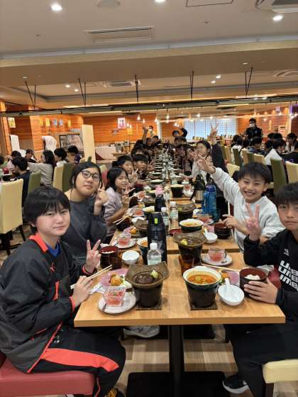 夕食を食べています。あっという間の1日目でした。この後はレクリエーションと振り返りです。