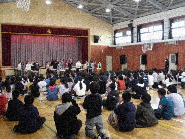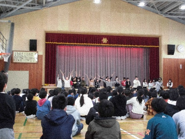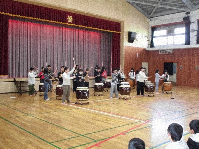 今日は、部活動の和太鼓部が昼休みを使って演奏会をしました。体育館にはたくさんの子ども達が集まり、演奏に聴き入っていました。