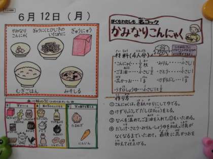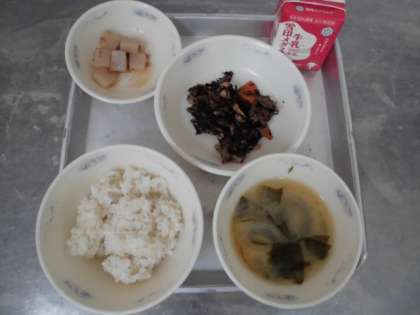 今日の給食は「麦ごはん,みそ汁,かみなりこんにゃく,牛肉とひじきの炒め煮,牛乳」でした。