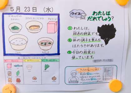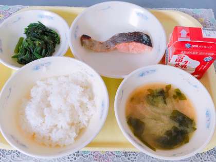 今日の給食は,「ごはん,牛乳,さけの塩こうじ焼き,ほうれん草のおかか煮,みそ汁」でした。
