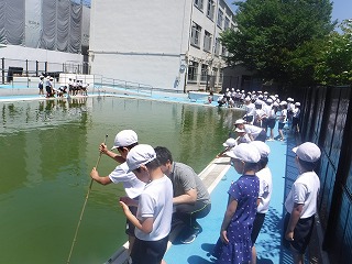 生活科の学習でプールのヤゴ取りをしました。プールの中に網を入れ,ゆっくりと引き上げると,枯れ葉などにまぎれているヤゴを見つけることができました。子ども達は,たくさんヤゴを見つけうれしそうにしていました。教室に戻った後も,ヤゴのいる水槽を興味深そうに眺めていました。