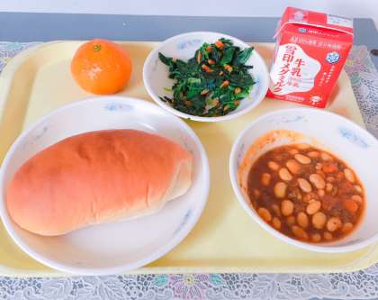 今日の給食は「味つけコッペパン,牛乳,チリコンカーン,ほうれん草のソテー,みかん」でした。