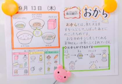 今日の給食は「麦ごはん,牛乳,おからそぼろのどんぐりのぐ,みそ汁,もやしのにびたし」でした。