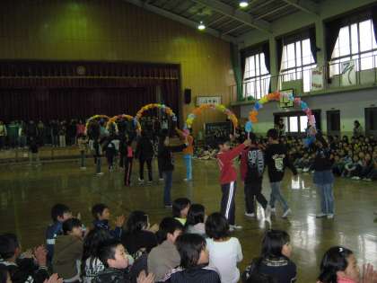 拍手の中,児童会代表委員の持つ手作りアーチを通って6年生が入場し,舞台の上に並びました。その前で,各学年が工夫を凝らした歌や演奏や振り付けや言葉などを盛り込んだ出し物をしました。
