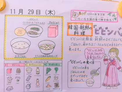 今日の給食は「麦ごはん,牛乳,ビビンバ(具)肉と卵,ビビンバ(具)ナムル,とうふと青菜のスープ」でした。