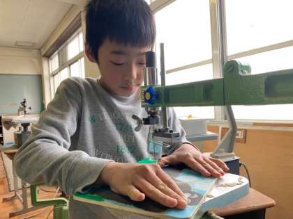 図画工作科の学習で,電動のこぎりを使っています。手元から目をはなさず,集中して使えました。手動の糸のこぎりよりも,曲線が切りやすかったですね。