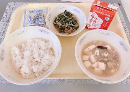 今日の給食は「麦ごはん,牛乳,豚肉ととうふのくず煮,ほうれん草ともやしのごま煮,じゃこ」でした。
