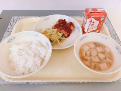 今日の給食は「ごはん,牛乳,チキンカツ,ソテー,みそ汁」でした。