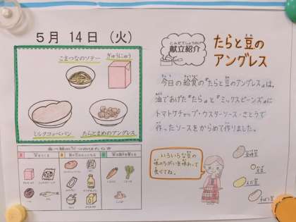 今日の給食は「ミルクコッペパン,牛乳,たらと豆のアングレス,小松菜のソテー」でした。