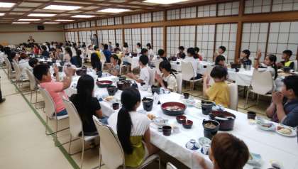 1日目の夜。楽しみにしていた夕食の時間。みんなで「いただきます」をして,おいしくいただきました。この後は,入浴です。