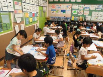 図工の学習で京都タワーを描いています。あるがままの姿だけにとらわれず,自分が思い描く今日の京都タワーをコンテや絵の具を用いて一生懸命仕上げていました。どんなタワーが見られるか楽しみですね♪