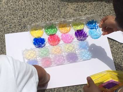 光を通す透明な材料に色を付け,光を当てて楽しみました。
