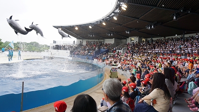 お弁当の後にイルカショーを見ました。3匹のイルカが登場するショーで,子ども達は驚いたり笑ったりと,とても楽しそうな様子でした。