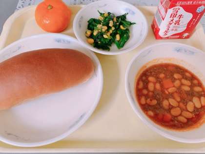 今日のきゅしょくは「黒糖コッペパン,牛乳,チリコンカーン,ほうれん草のソテー,みかん」でした。