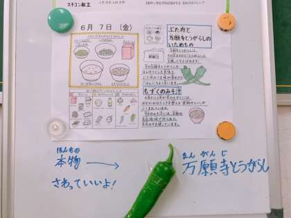 今日の給食は「胚芽米ごはん,牛乳,豚肉と万願寺とうがらしのいためもの,だいこん葉のごまいため,もずくのみそ汁」でした。