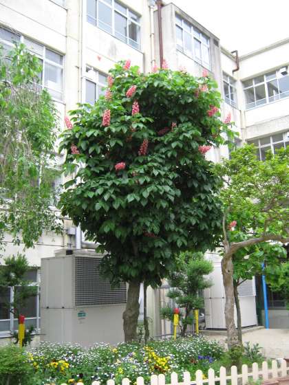 こんな樹木が見られます。その1「ベニバナトチノキ」 公開日 2011/05/10 更新日 2011/05/10 勧修の自然 5月10日(火),天気予報どおりに雨が降り出しました。家庭訪問期間中に,こんなに雨が降るのは珍しいなと思っています。雨上がりのひと時,南校舎の北側に鮮やかな赤い花が目に付きました。たまたま本校に立ち寄ってくださった田渕春三先生に確認するとベニバナトチノキでした。 ※田渕先生からの私への宿題(樹木にネームプレートを付ける)を早く実現しなければならないと思っています。