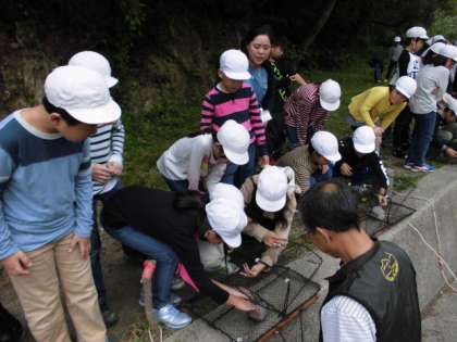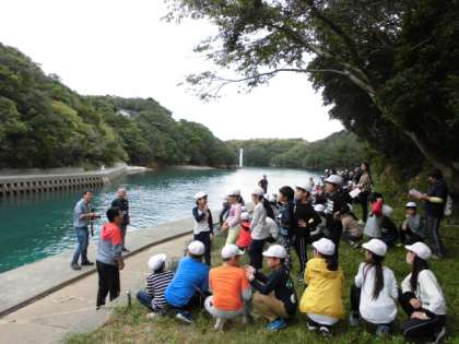 撒き餌を入れたかごを海(深谷水道)に投げ込みました。子どもたちは,かごの中に入っていてほしい魚の名前を大声で呼んでいました。明日,大きな魚が入っているとよいですね。