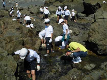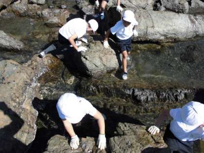 あちらこちらにある潮だまりをゆっくりのぞいてみました。そこにはたくさんの貝や魚,かになどがいて,子どもたちは大興奮です。