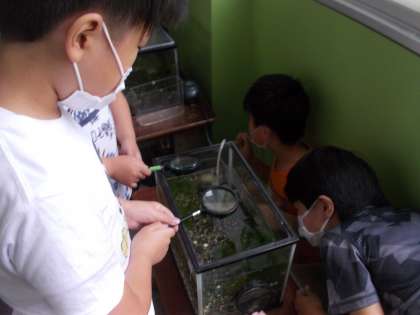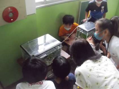 廊下に水槽を置いてあるので,皆興味津々な様子です。休み時間にもルーペを使ってオスとメスを見分けたり,お腹がふくらんできたので卵をもっているんじゃないか,など推測したりと高い関心をもって観察しています。