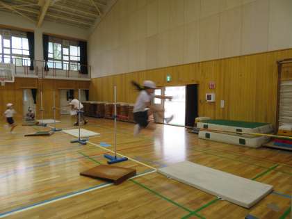 体育科「高とび」の授業の様子です。少しでも高い高さを跳ぶために助走や跳び方を工夫して学習に取り組んでいました。1回目授業の時よりも記録がのび,一人一人が全力で頑張っていました。