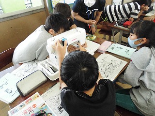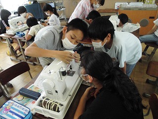 1、2時間目は5年生で一度使っているミシンの使い方を復習しました。針穴に糸を入れるのに苦戦しながらも,班の友だちと協力しながら全員が下糸と上糸を通すことに成功しました。