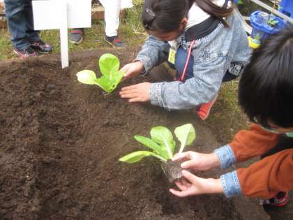 国語で学習している「おおきなかぶ」のお話に合わせて,「あまいあまいだいこんになれ」と種や苗に声をかけている子がたくさんいました。