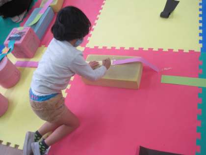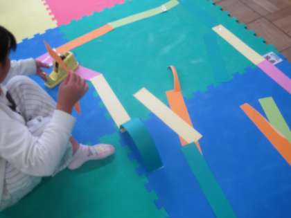 図画工作の時間にプレイルームでたくさん色画用紙を繋げました。