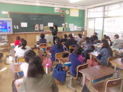 「いたいっ!」がうんだ大発明の読み聞かせをしていただきました。バンドエイドが誕生したお話についてとても楽しく理解することができたようです。毎回子どもたちをお話の世界へとひきこんでくれるくすくすさん,ありがとうございます!