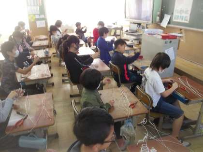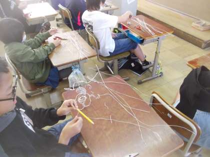 図工科ではアルミ線を使って,造形活動を行いました。ペンチを使って2本をねじってつなげたり,アルミ線を切ったりと目を輝かせて活動できました。