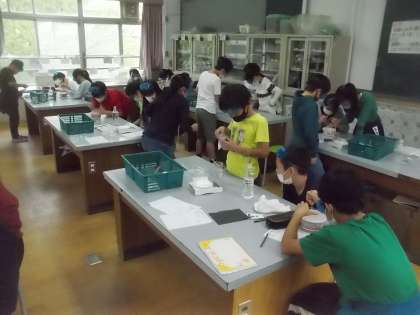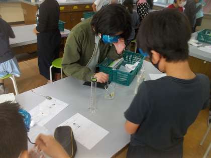 理科では「もののとけかた」の実験を中心とした学習活動を進めています。塩とミョウバンを溶かす実験ではグループで協力して実験結果から考えられることを考察するなど,学び合いながら学習をしています。