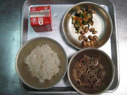 献立内容 麦ごはん,牛乳,牛丼の具,とら豆の甘煮,小松菜の煮びたし
