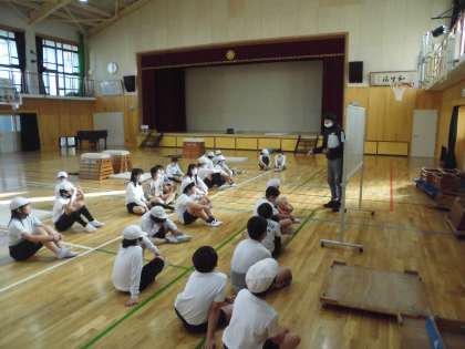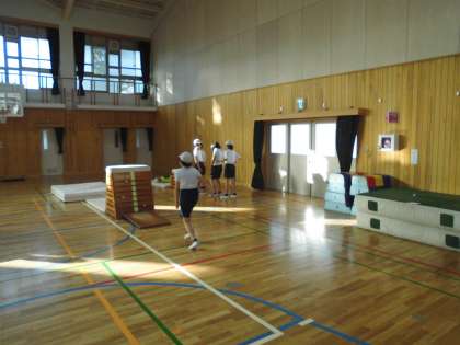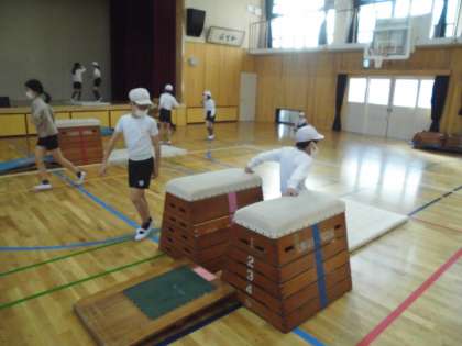 体育科でとび箱運動の学習がはじまりました。後半のねらい2では,どうすればより技が美しくなるかを友だちと教えあいながら学習を進めています。
