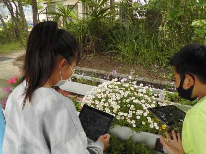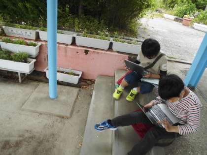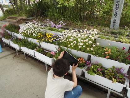 図工科では,6年間の思い出がつまった校舎を描きます。それだけだと少しさみしいので,学校に咲いているお花をそえた絵にしました。題材をタブレットのカメラ機能を使って探します。教室で描く際には拡大も簡単にできるため,とっても役に立っています。