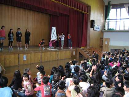 「○○先生の体重は,○kgより少ない」とか,「一番若い先生は,○○先生です」などの問題が次々と出題されました。問題ごとに子ども達がフロアで各自が手で○×を作って参加しました。正解だと,「イエーッ。」と,歓声を上げる子ども達。楽しいひと時でした。