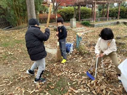 熊手ほうきや竹ぼうきで一生懸命落ち葉を集めます。